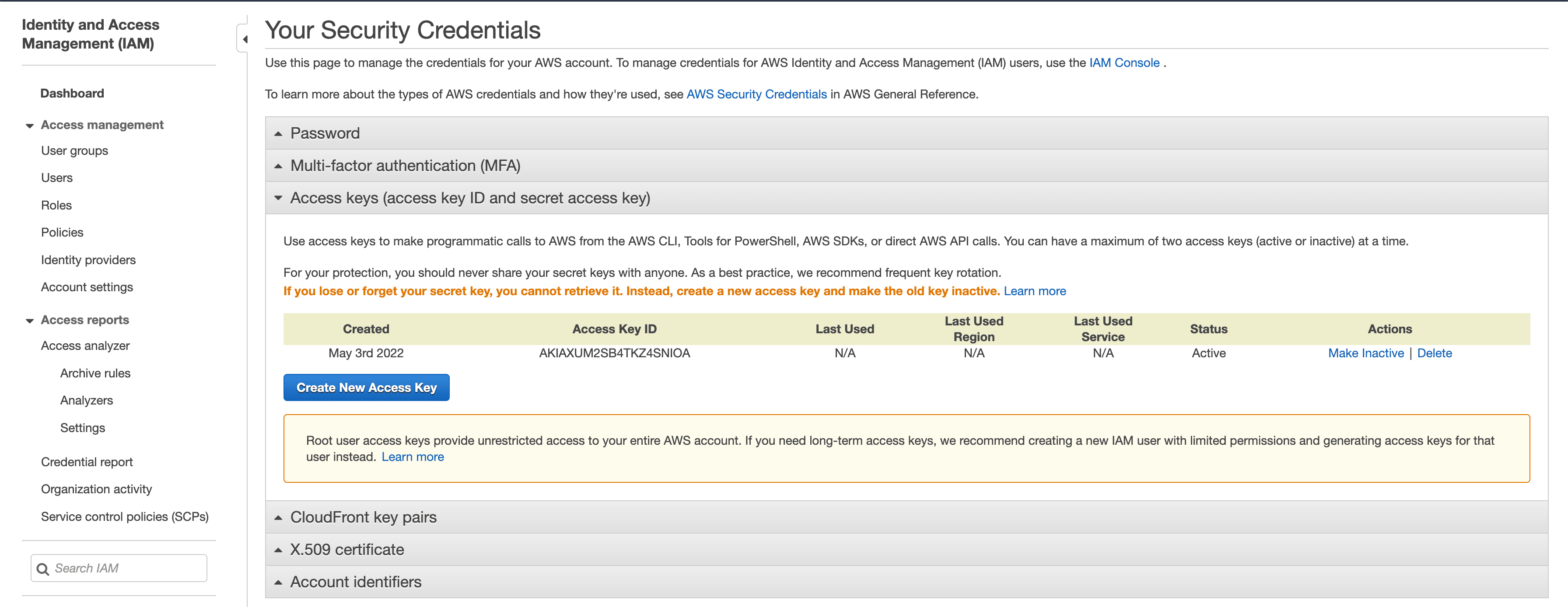 Once you’ve downloaded the credentials, you should see the access key ID in the table. Note that you won’t be able to access your secret key again at this point. You would need to make a new set of credentials if you don’t have it.