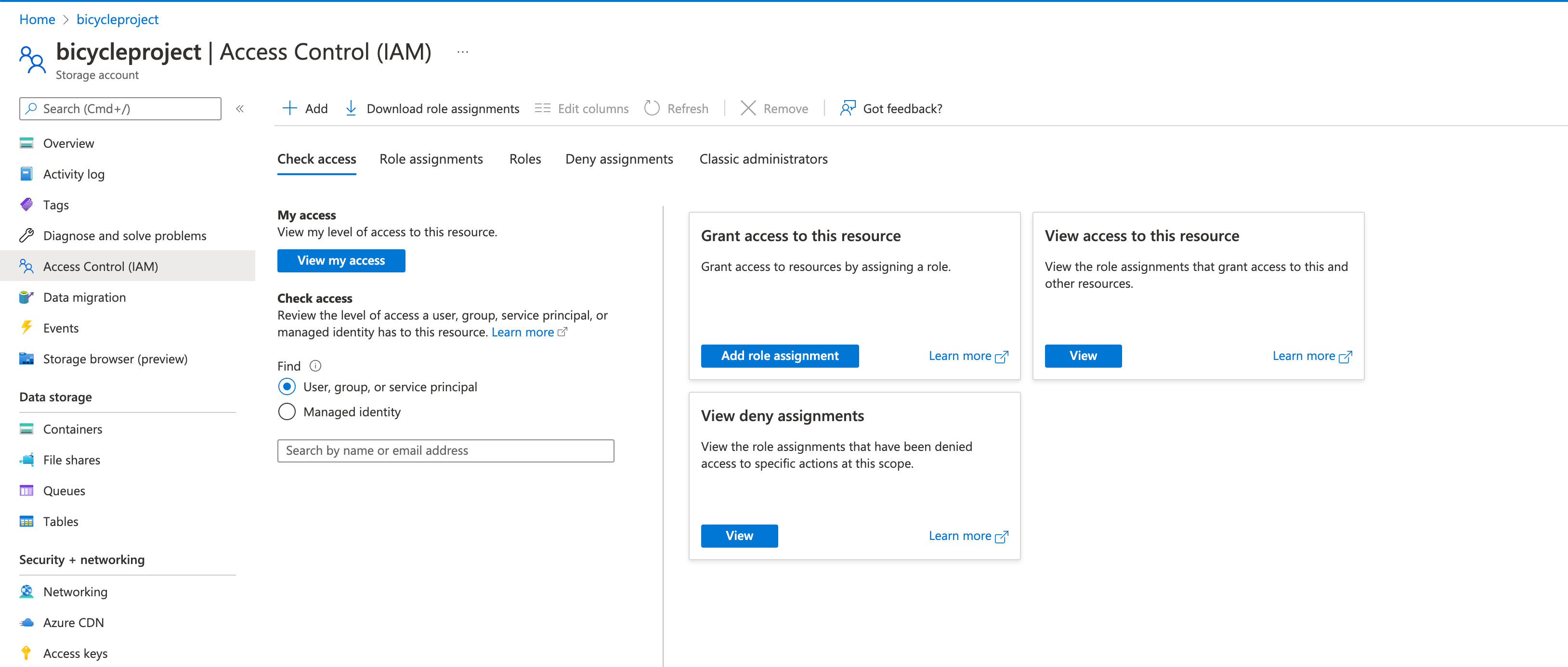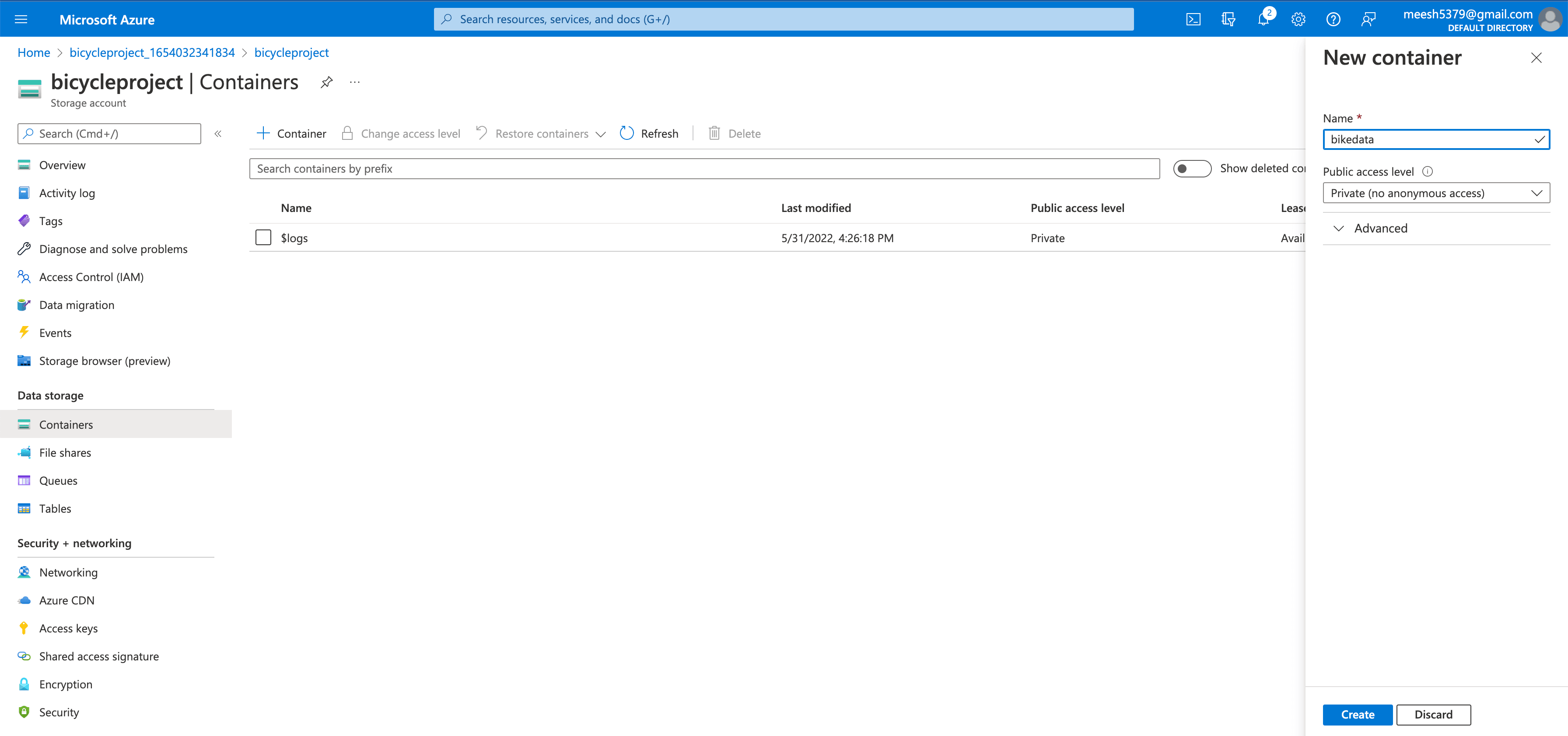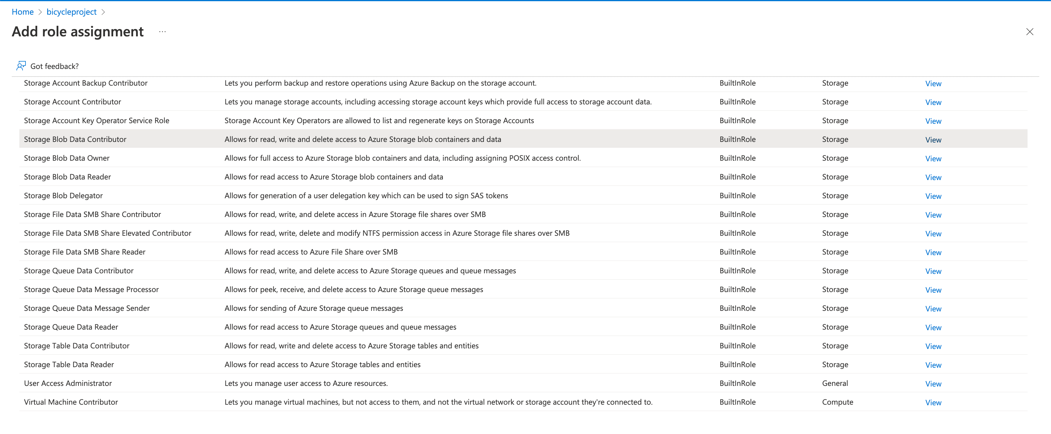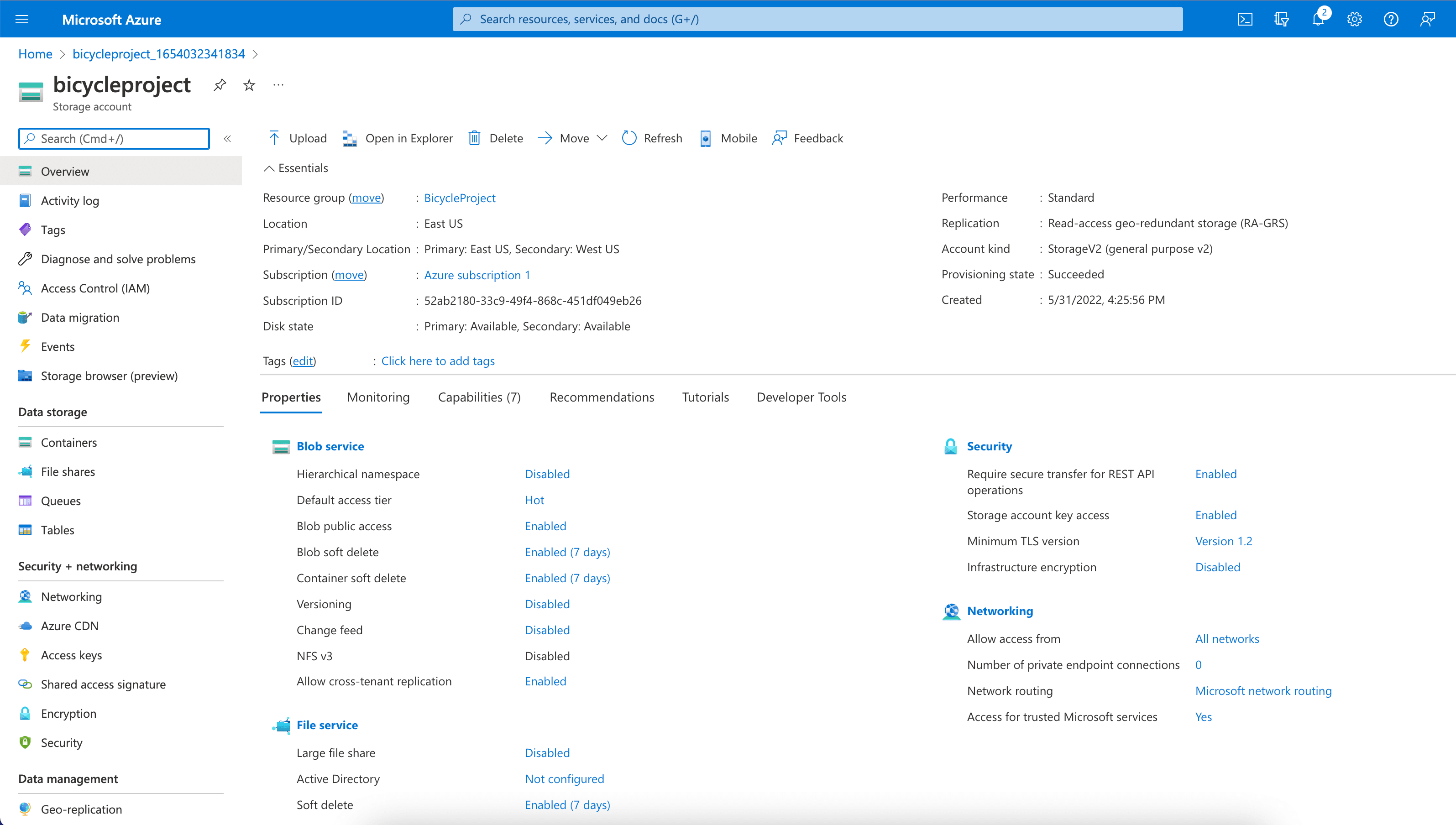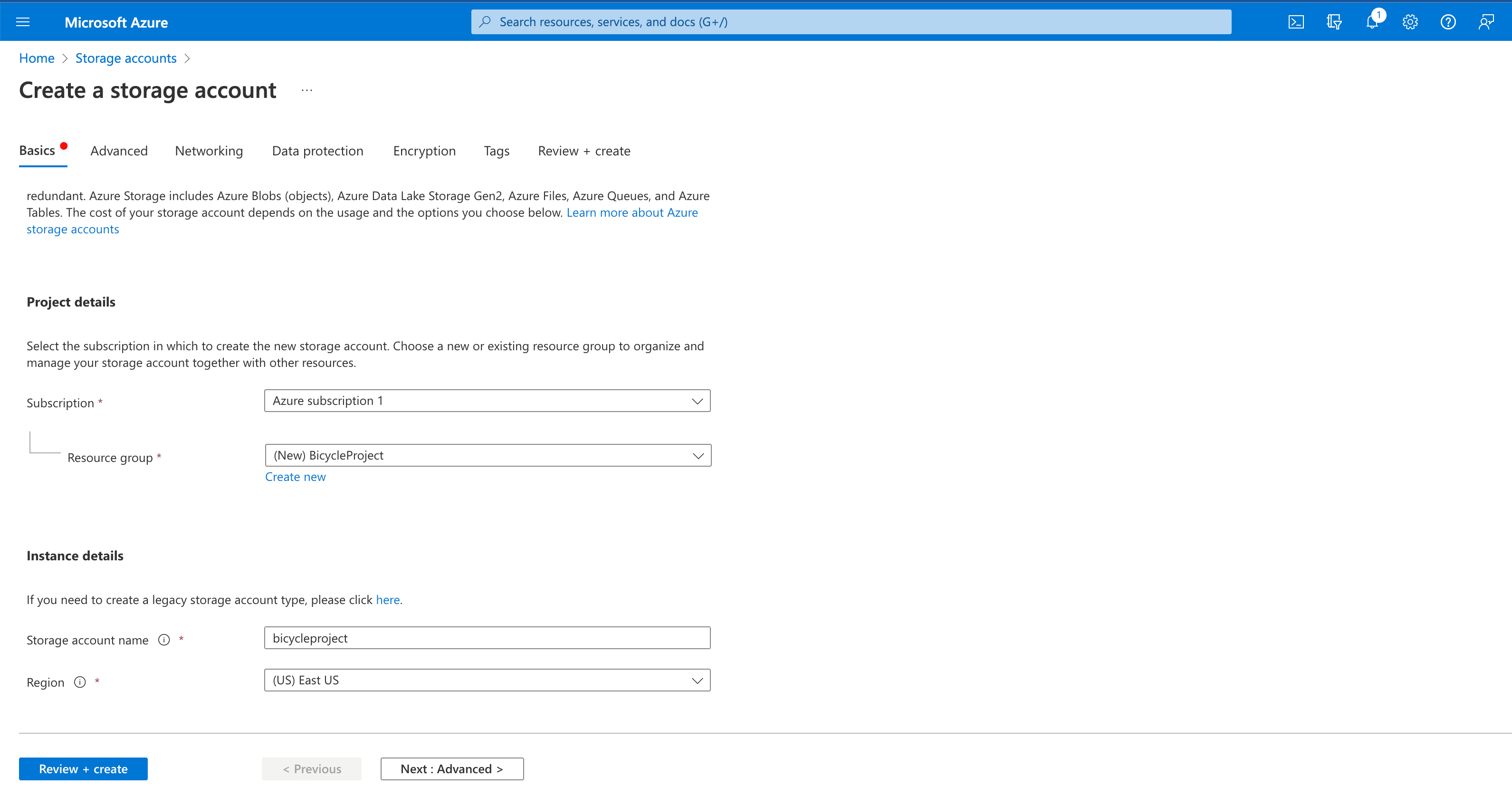 BicycleProject. We'll name this storage account bicycleproject. Then you can