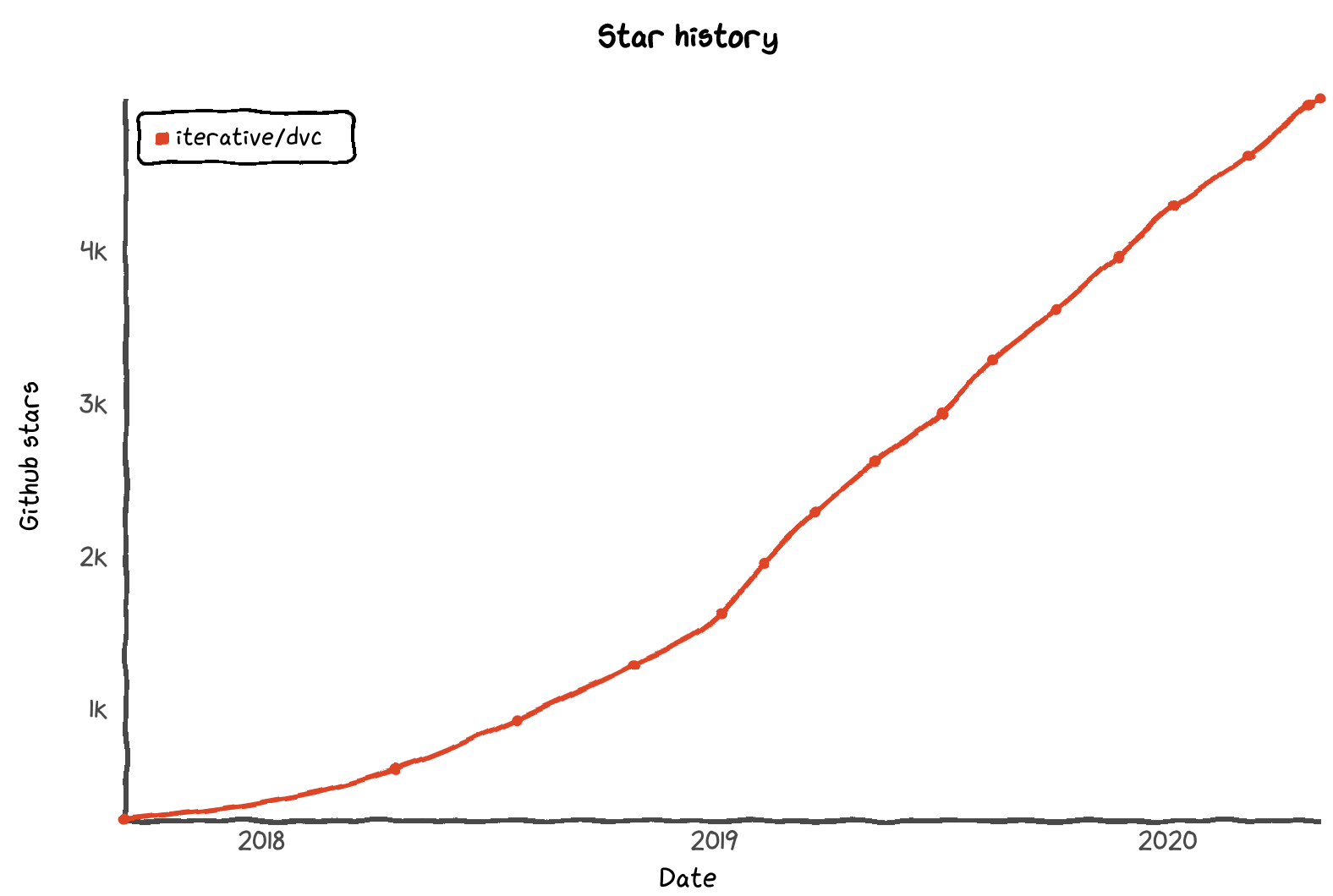 Activity on our GitHub page has grown organically since the DVC repo went public on May 4th, 2017. Coincidentally, today, in the 3rd year anniversary we have reached 5000 starts: