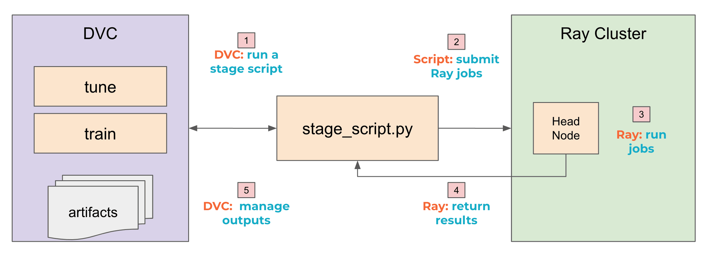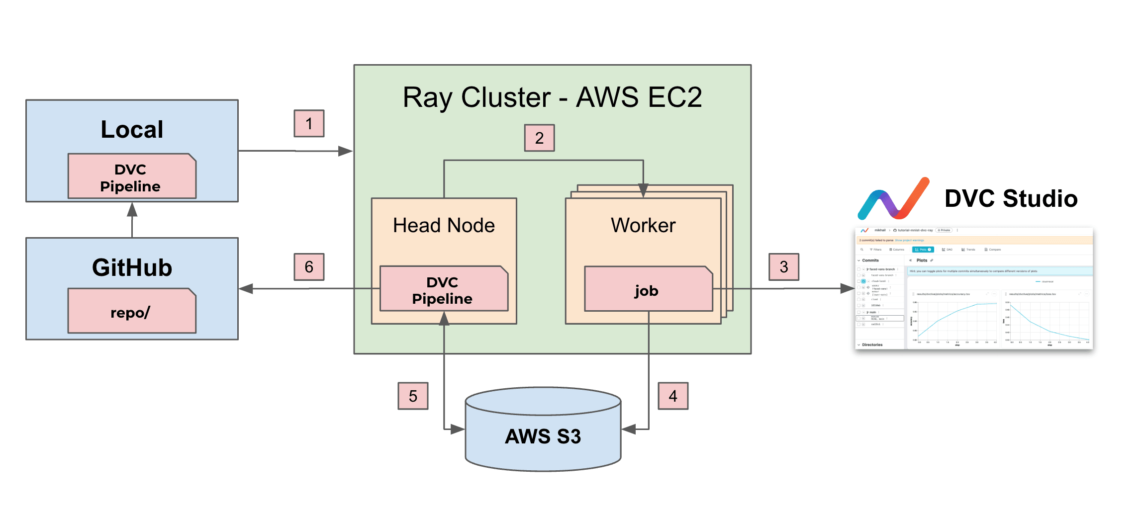 - Users can manage Ray Cluster and run DVC pipelines from a “local” environment.