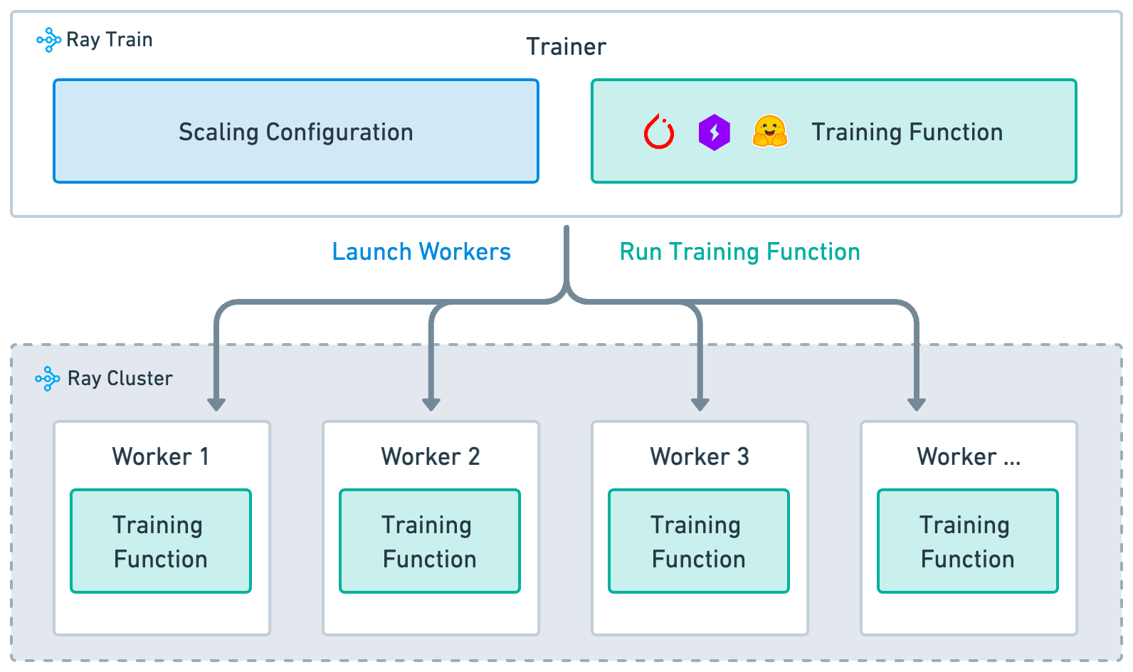 Ray Train creates a setup to scale model training code from a single machine to a cluster of machines in the cloud and abstracts away the complexities of distributed computing. At a high level of abstraction, it distributes and runs training jobs among worker nodes.