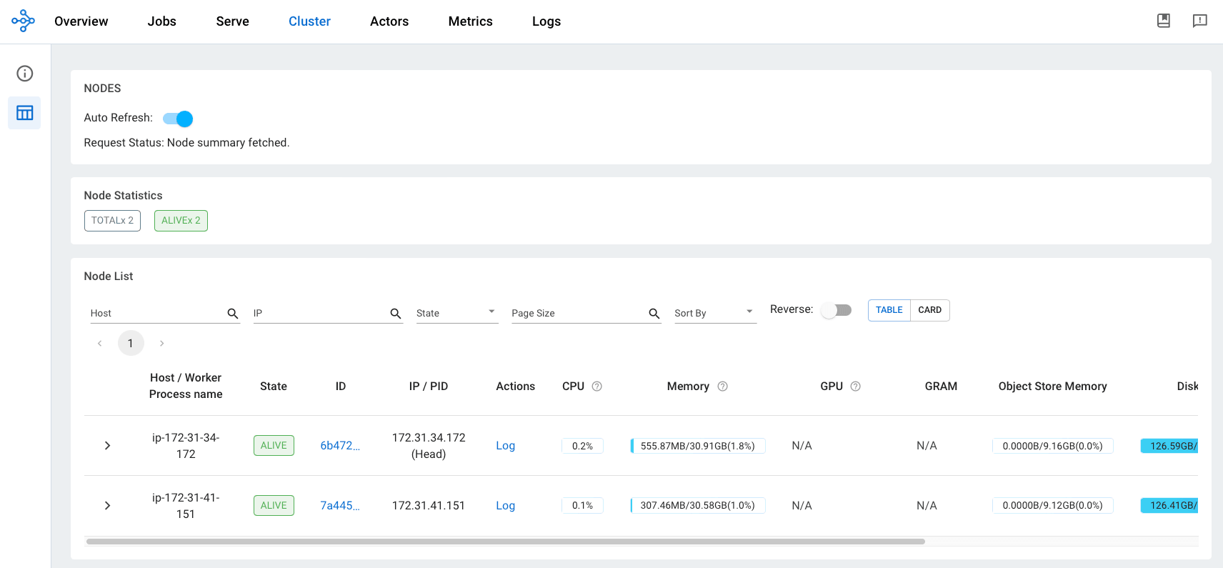ray up cluster.yamlYou can access the Ray dashboard once your Ray cluster is running. This dashboard provides a real-time view of your cluster's status, including resource utilization, task progress, and logs.