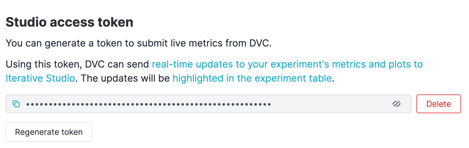 )Additionally, we can also use Studio to analyze and visualize the results of our experiments, making it easy to share and collaborate with others. By providing the STUDIO_TOKEN, DVCLive will automatically post the results of the experiment to Studio. To do this, first, let’s obtain an individual token from the user profile page in Studio.