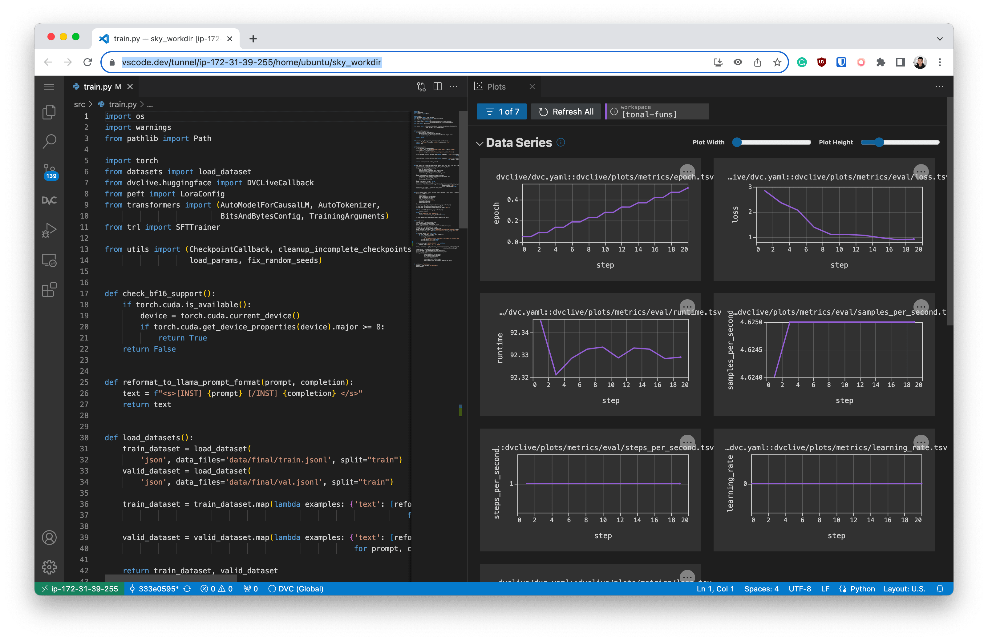 The price, of course, isn’t the only important factor. There are other low-cost Jupyter-based development environments like Google Colab or Kaggle Notebooks. While Jupyter environment is convenient when developing prototypes, the key advantage of the everything-as-code (EaC) approach proposed here is centralizing your code, datasets, hyperparameters, model weights, training infrastructure and development environment in a git repository. With LLMs being notoriously unpredictable, maintaining tight version control over training is critical.
