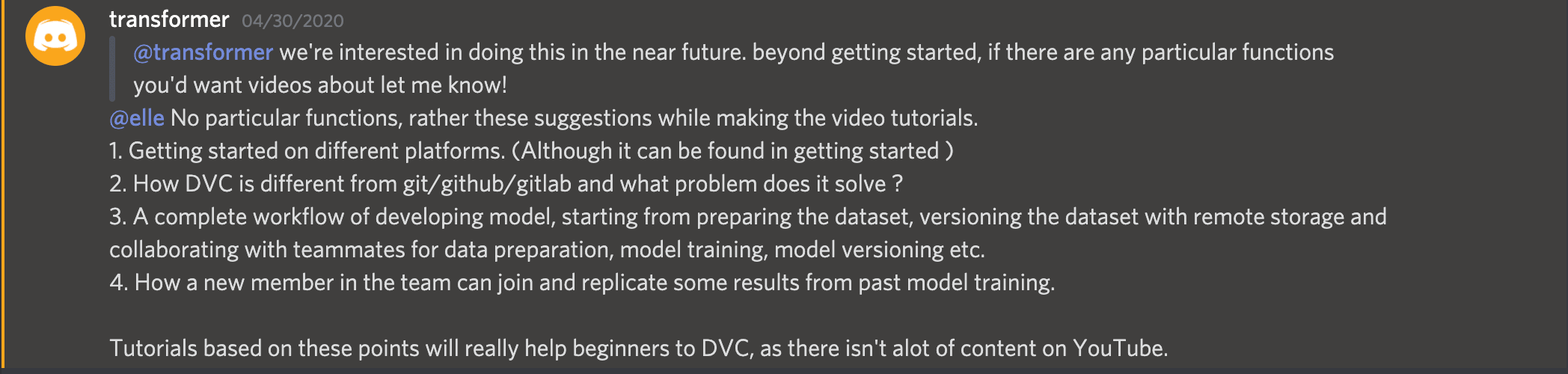 One of DVC's priorities for this year is creating a library of video tutorials ranging from short explanations of basic DVC functions to more advanced use cases. You could assist in writing the scripts or even take the lead producing some videos, so image/video editing skills would come in handy (optional).