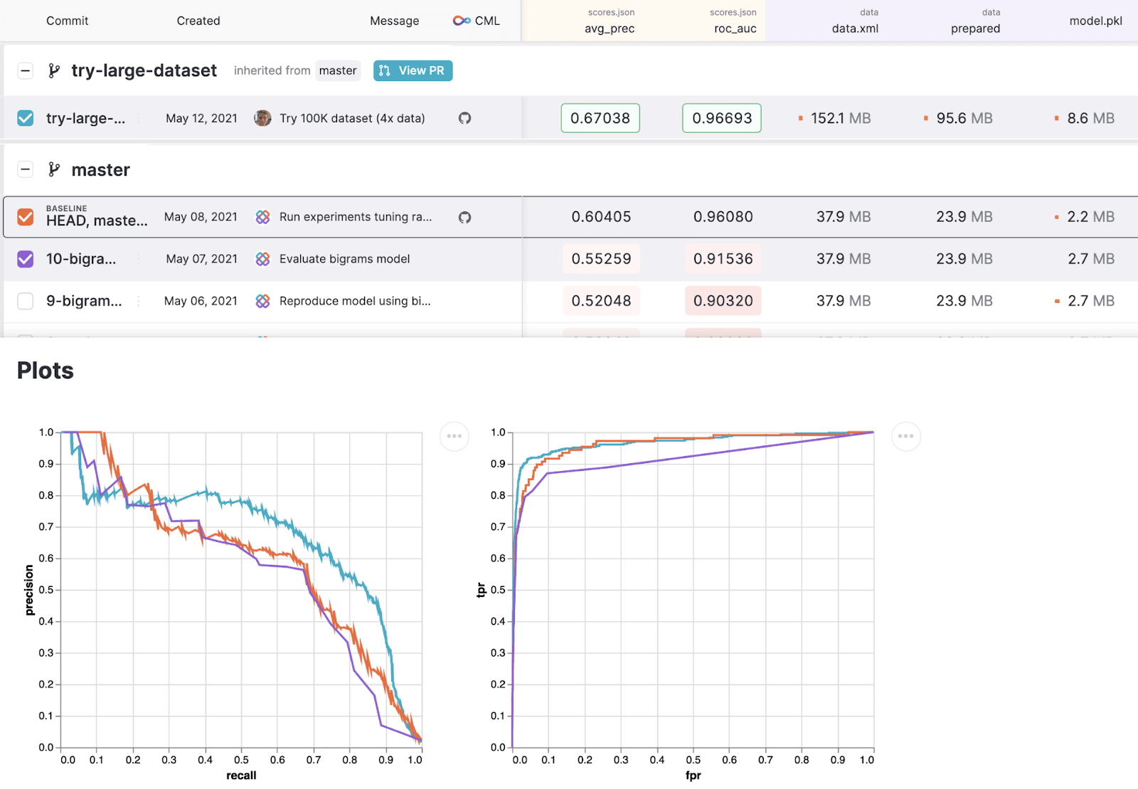 DVC, along with Git, performs your ML bookkeeping automatically. Using a simple UI, you can import your experiment history from Git. You can get quick access to important metrics across multiple projects, or dive deep and explore individual experiments. You can visualize and compare models the way that best fits your needs, whether it is through precision-recall curves, scores comparison, or trend charts showing how your model is evolving over time.