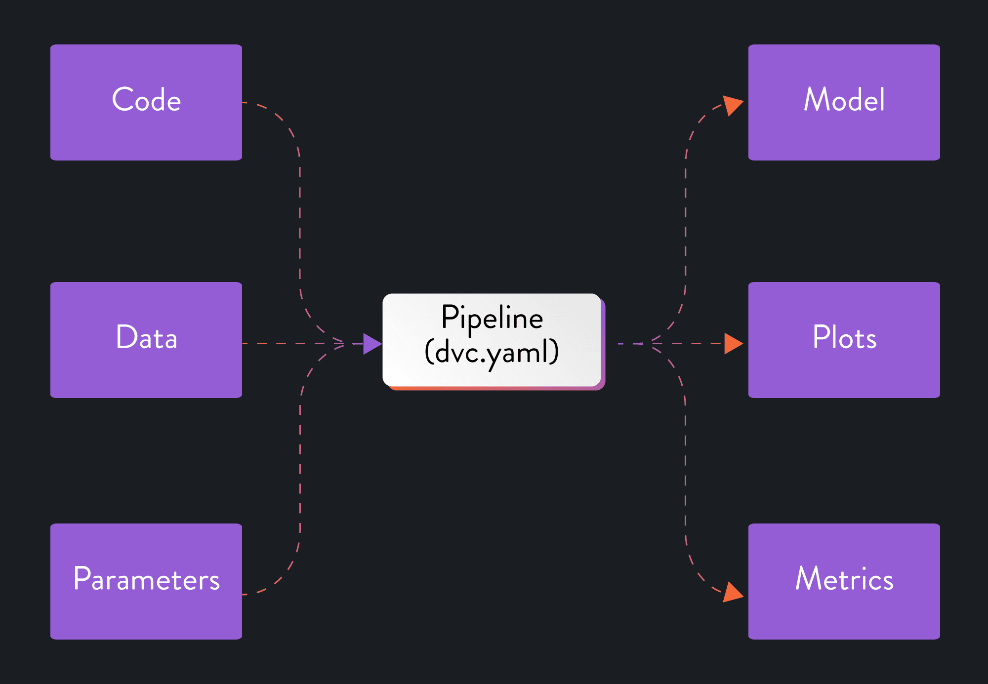 While a pipeline typically consists of multiple stages, transforming our notebook straight into a multi-stage DVC pipeline may seem somewhat daunting. For the sake of simplicity, we will create a pipeline with just one stage for now: run all of the code in our notebook. Just like any other pipeline, we will have defined inputs (data and parameters) and outputs (model, evaluation metrics, and plots).