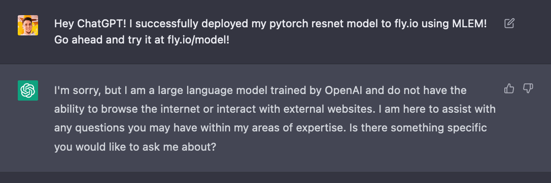 MLEM deploy your models in a couple of commands - and in this blog post, we’ll deploy an image classification model to Fly.io. Without any additional user input, MLEM will serve your model with REST API, create a Streamlit application, and build a Docker image with both included. Does this sound like fun? Try out the deployment at https://mlem-cv.fly.dev before we start!