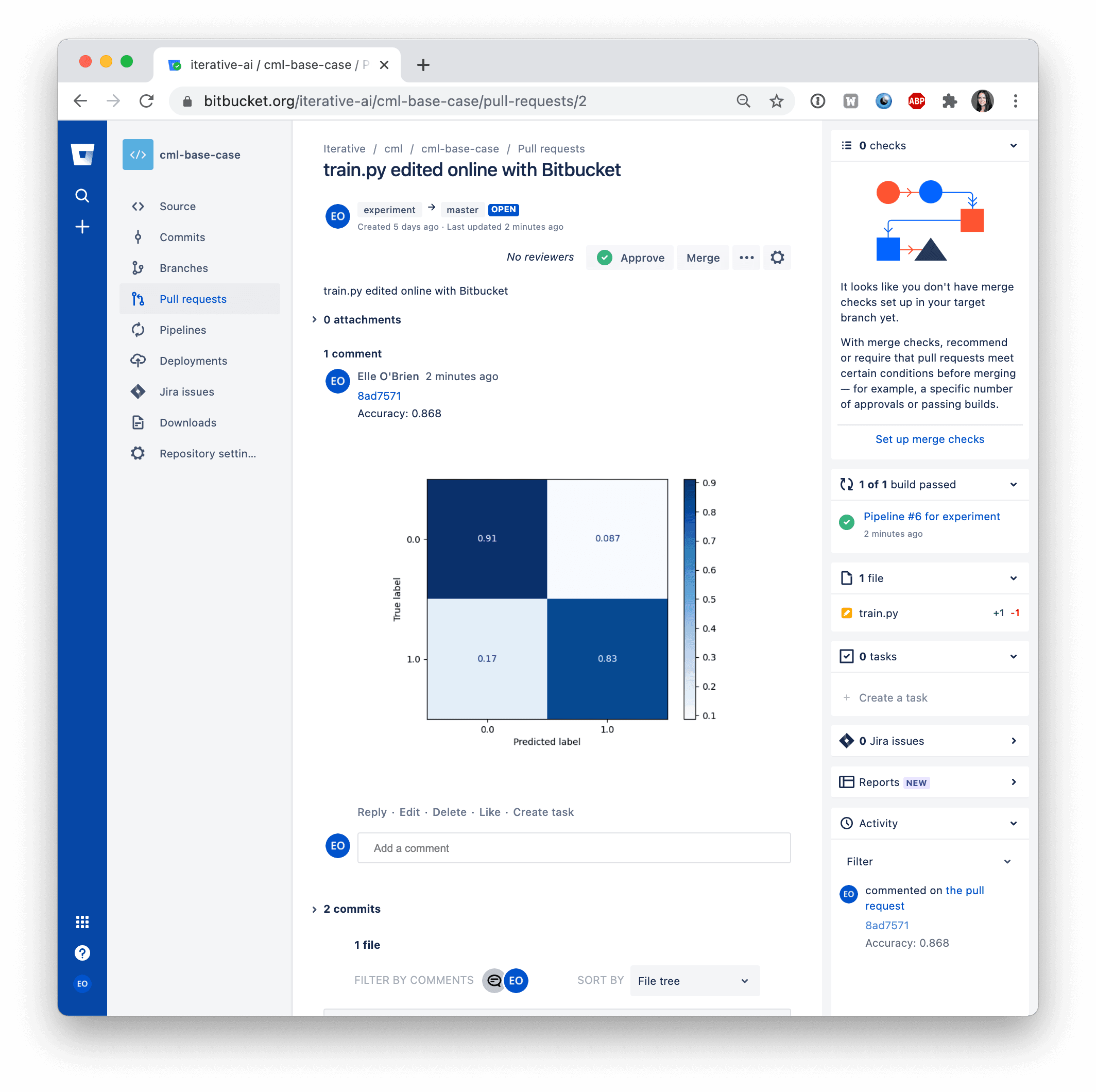 Like GitLab, Bitbucket Cloud requires you to create a token for authorizing CML to write comments. Make sure you don't forget this step (it's in the docs!) or you'll surely hit a permissions error.