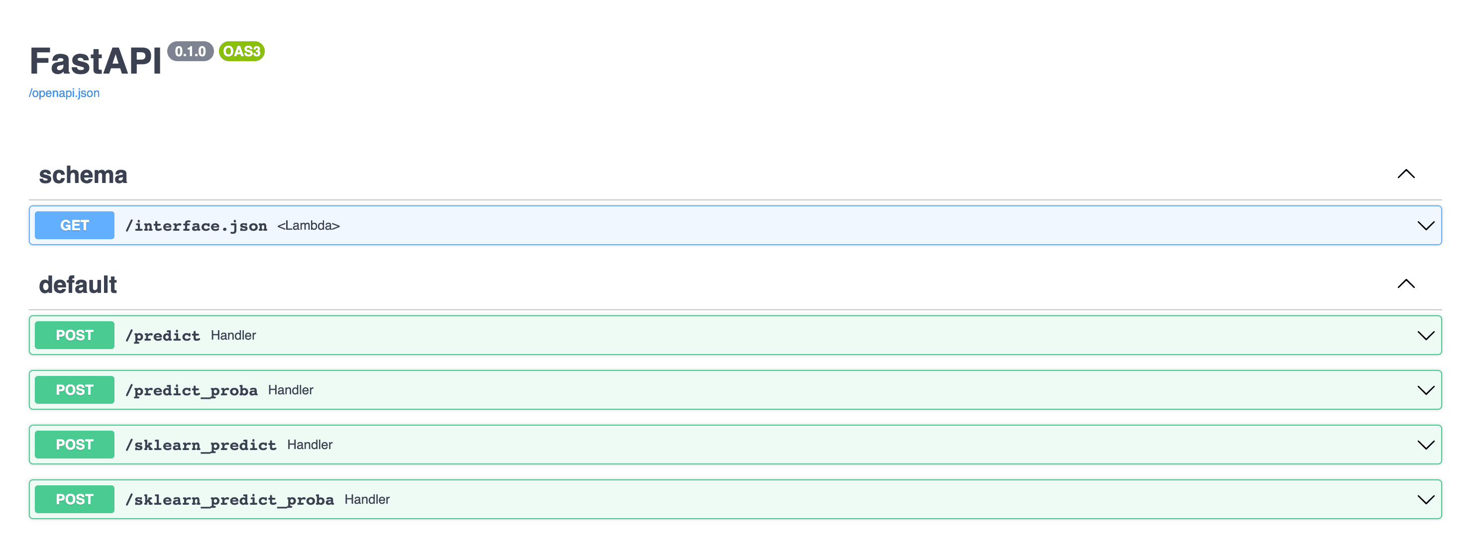 $ mlem serve clf fastapiThis will run a local server and spin up a web API for you so you can quickly test out your model without needing a development team to work on the API initially.
