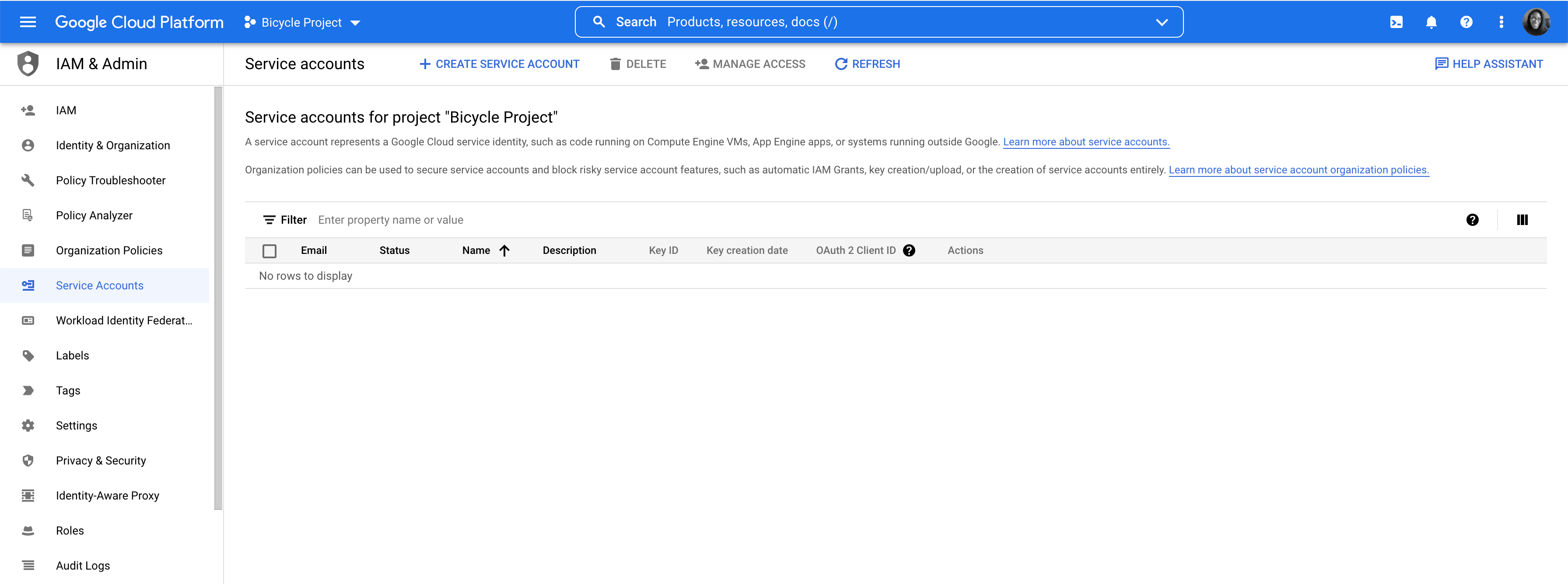 $ gcloud auth activate-service-account bicycle-service-account@tonal-history-154018.iam.gserviceaccount.com --key-file=../tonal-history-154018-e62a79baf90f.jsonIf you don't have the GCP CLI installed and you want to use the service account,